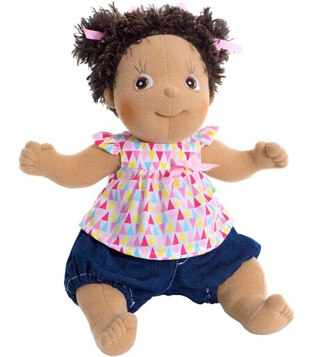 Dette er en dukke fra Rubens børn. Denne serie hedder Rubens Kids, de kommer med det tøj de har på, men der er mere at købe, hvis det ønskes. Rubens fokus er altid på børn, et barn der leger og interagerer med en dukke fra Rubens Børn udvikler sin empati til senere at blive en mere forstående og social voksen. Rubens Barn-dukkernes øjne og ansigtstræk er det, der gør dem unikke sammenlignet med alle andre dukker. Det er ingen hemmelighed at deres popularitet afhænger meget af deres glade og "menneskelige" udseende, hvis du holder dukken i dine arme får du en unik øjenkontakt. Dukkernes hår er lavet af 100% polyester, huden af 100% polyester fleece og polstringen i 100% polyesterfibre. Vægtposen er fyldt med 100% calciumcarbonatgranulat. Alle dukker kan maskinvaskes ved 30°C og tørretumbles ved lav temperatur. Alt tøj anbefales håndvasket. Dimensioner Rubens Kids: 36 cm, Vægt: 350 g. Anbefalet fra 0 år. ...