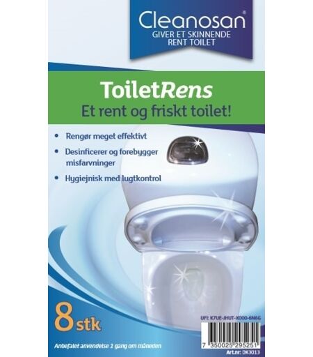 Cleanosan toiletrens holder dit toilet rent og pæntMed Cleanosan toiletrens får du effektive rengøringstabs til rengøringen af toilettet. Tabletterne forebygger misfarvninger og rengør toilettet i alle kroge, så det bliver skinnende rent. Tabletterne er hygiejniske og er med til at fjerne dårlig lugt, samtidig med at de sikrer en effektiv rengøring og desinficering af dit toilet. Fjern folien fra tabletterne og læg en tablet i toilettet og lad den virke i 1-8 timer, ca. en gang om måneden, for at opnå et rent og friskt toilet.Antal tabs: 8 stk.Rengør og desinficerer toilettetForebygger misfarvning og dårlig lugt ...