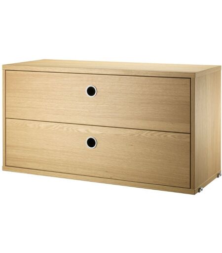 String Furniture Cabinet With Two Drawers 78x42x30 cm - Oak Skønt lille skab med to skuffer fra String Furniture. Skabet passer ind i både Wire og Plex panelerne fra String Furniture systemet, med en dybde på 30 cm. Skabet er en fin og sjov tilføjelse til dit setup og tilfører derudover også ekstra opbevaringsplads. Brug skabet til opbevaring i stuen eller entréen og gem diverse ting væk, så de ikke ligger og roder. Designer: String Furniture Materiale: Fineret spånplade Mål: B: 78 cm D: 30 cm H: 42 cm Bemærk: Max belastning er 25 kg fordelt på hele møblet. Møblet kommer ikke samlet. Vedligeholdelse: Tør af med en ren klud. Brug altid underlag under varme objekter. Tjek engang imellem om alle skruer mm. er skruet ordentlig i. ...
