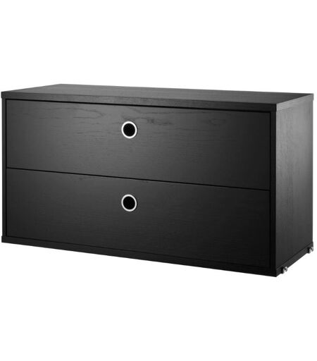 String Furniture Cabinet With Two Drawers 78x42x30 cm - Black Stained Ash Skønt lille skab med to skuffer fra String Furniture. Skabet passer ind i både Wire og Plex panelerne fra String Furniture systemet, med en dybde på 30 cm. Skabet er en fin og sjov tilføjelse til dit setup og tilfører derudover også ekstra opbevaringsplads. Brug skabet til opbevaring i stuen eller entréen og gem diverse ting væk, så de ikke ligger og roder. Designer: String Furniture Materiale: Fineret spånplade Mål: B: 78 cm D: 30 cm H: 42 cm Bemærk: Max belastning er 25 kg fordelt på hele møblet. Møblet kommer ikke samlet. Vedligeholdelse: Tør af med en ren klud. Brug altid underlag under varme objekter. Tjek engang imellem om alle skruer mm. er skruet ordentlig i. ...