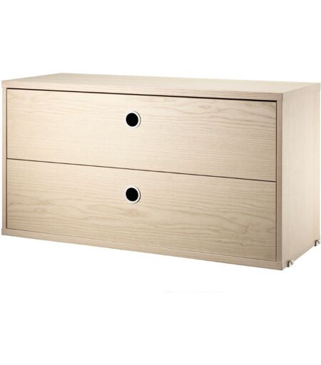 String Furniture Cabinet With Two Drawers 78x42x30 cm - Ash Skønt lille skab med to skuffer fra String Furniture. Skabet passer ind i både Wire og Plex panelerne fra String Furniture systemet, med en dybde på 30 cm. Skabet er en fin og sjov tilføjelse til dit setup og tilfører derudover også ekstra opbevaringsplads. Brug skabet til opbevaring i stuen eller entréen og gem diverse ting væk, så de ikke ligger og roder. Designer: String Furniture Materiale: Fineret spånplade Mål: B: 78 cm D: 30 cm H: 42 cm Bemærk: Max belastning er 25 kg fordelt på hele møblet. Møblet kommer ikke samlet. Vedligeholdelse: Tør af med en ren klud. Brug altid underlag under varme objekter. Tjek engang imellem om alle skruer mm. er skruet ordentlig i. ...