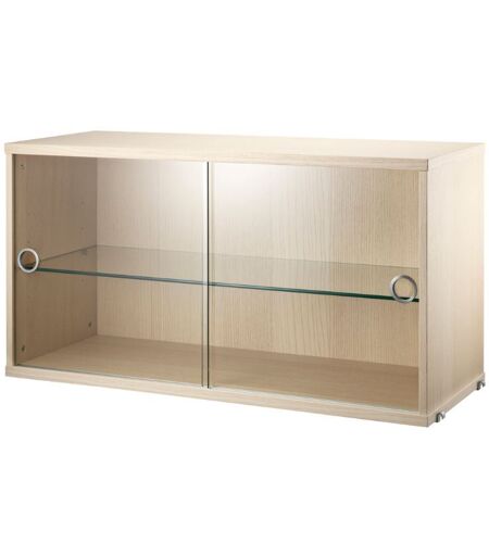 String Furniture Display Cabinet With Sliding Glass Doors B: 78 cm - Ash Skønt lille skab med to glas skydelåger fra String Furniture. Skabet passer ind i Wire panelerne fra String Furniture systemet, med en dybde på 30 cm. Skabet er en fin og sjov tilføjelse til dit setup og tilfører derudover også ekstra opbevaringsplads. Skabet kommer med én justebar hylde i glas. Brug skabet til opbevaring i stuen eller køkkenet og placer smukt interiør der er værd at vise frem. Designer: String Furniture Materiale: Fineret spånplade Glas Mål: B: 78 cm D: 30 cm H: 42 cm Bemærk: Max belastning er 15 kg fordelt på hele møblet. Møblet kommer ikke samlet. Vedligeholdelse: Tør af med en ren klud. Brug altid underlag under varme objekter. Tjek engang imellem om alle skruer mm. er skruet ordentlig i. ...