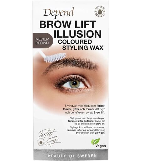 Depend Cosmetic PE Brow Lift Illusion Coloured Styling Wax - Medium Brown er en farvet stylingvoks, som gør det nemt at fremhæve dine øjenbryn efter sidste nye trend. Denne stylingvoks farver, tæmmer, løfter og former hvert hårstrå og giver effekten af et Brow Lift. Den fikserer med det samme og holder brynene flot på plads hele dagen uden at gå af i flager. Påføres med den medfølgende børste. Giv dine øjenbryn den opmærksomhed de fortjener med denne fantastiske stylingvoks! Fordele: Farvet stylingvoks til øjenbryn Farver, tæmmer, løfter og former brynene Giver effekten af et Brow Lift Fikserer øjeblikkeligt Holder hele dagen Går ikke af i flager Vegansk Anvendelse: Påføres med den medfølgende børste Style brynene som ønsket Ingrediensliste: Aqua, Ceteareth-25, Sorbitol, PEG-8, Triethanolamine, Heptyl Undecylenate, Hydrogenated Rapeseed Oil, Phenoxyethanol, Acrylates Copolymer, Caprylyl Glycol, Sodium Lauryl Sulfate, Sorbic Acid, +/- CI 77491, CI 77492, CI 77499, CI 77891. ...