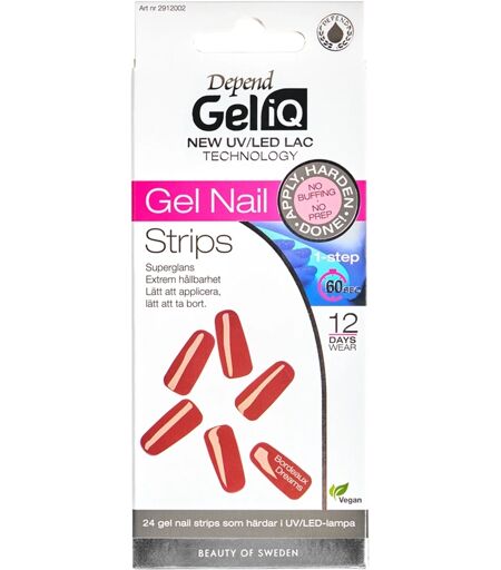 Depend Cosmetic Gel iQ Gel Nail Strips 24 Pieces - Bordeaux Dreams er supersmarte gel neglestrips, som i blot et trin giver dig smukke negle med superglans og salonfinish. Med Depends 1‑trinsteknik kan du hurtigt og nemt lave en holdbar og perfekt manicure hjemme. Disse strips er fremstillet af en højkvalitetsgel, der skal hærdes i 60 sekunder under en UV/LED-lampe og som holder i op til 12 dage. De er nemme at sætte på og nemme at tage af igen! Vil du gerne opnå smukke, glansfulde gelnegle, uden at skulle bruge tid på at lakere og hærde neglene ad flere omgange? Så er disse smarte gel neglestrips lige noget for dig! Fordele: Gel neglestrips Nemme at sætte på og tage af Skal hærdes 60 sekunder under UV/LED-lampe Superglans og salonfinish Holder i op til 12 dage Indeholder 24 stk. neglestrips, 1 stk. neglefil, 1 stk. manicurepind, 2 stk. renseservietter og brugsanvisning Anvendelse: Læs hele brugsanvisningen grundigt inden brug og følg den den nøje for at opnå det bedste resultat Forbered dine negle ved at fjerne gammel neglelak, file neglene i samme længde og forsigtigt skubbe neglebåndende tilbage Vask hænderne grundigt og lad dem tørre helt Vælg den rigtige størrelse strip til hver negl, vælg hellere en lidt smallere end for bred strip Rengør neglene med de medfølgende renseservietter Brug manicurepinden til forsigtigt at løfte strippen op i bagkanten (OBS! Undgå at berøre den klæbrige bagside) Sæt den forreste del af strippen tilbage på arket, så den bagerste del stikker udenfor arket Placér strippen tæt op ad, men ikke på, neglebåndet Tryk/træk forsigtigt ned mod neglekanten hele vejen rundt for at undgå luftbobler Brug fingrene eller manicurepinden til at trykke fast med langs kanterne, så strippen indkapsler neglen Klip strippen til tæt ved din naturlige negls forkant Hærd i 60 sekunder i UV/LED-lampen For optimal hærdning af Nail Strips holdes lampen 10 cm over neglene. Dette giver bedst fleksibilitet og holdbarhed Fil efterfølgende forsigtigt neglens kant for at gøre den jævn Afslut evt. med et lag Gel iQ Top Coat + hærdning for at øge holdbarheden Fjern stripsene igen med Depend Cosmetic Gel iQ Remover Oil OBS: Disse neglestrips er meget lysfølsomme. Undgå derfor at have pakningen åben, når du sætter dem på. Dette gælder både udendørs og i direkte sollys indendørs. Advarsel: Læs brugsanvisningen omhyggeligt før brug, og følg den nøje Opbevares utilgængeligt for børn Kan forårsage allergisk reaktion Undgå kontakt med øjne, mund og hud. Ved kontakt. Skyl omgående med vand Stop med at bruge produktet, hvis der opstår rødme eller kløe. Ved vedvarende gener: Søg lægehjælp Produktet er ikke beregnet til personer under 16 år Ingrediensliste: Acrylates Copolymer, Polymethyl Methacrylate, Triethoxycaprylylsilane, Polyethylene Terephthalate, Hydroxycyclohexyl Phenyl Ketone, Silica, Mica, +/-, CI 15850, CI 77266, CI 77492, CI 77510, CI 77891. ...