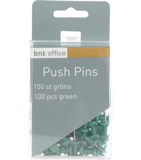 Push Pins i flotte farverMed Office Push Pins får du praktiske og farverige tegnestifter som nemt kan fastgøres til bløde underlag som f.eks. opslagstavler og korktavler. De små push pins er et must-have på ethvert kontor, da de giver god mulighed for en simpel organisering af f.eks. opslag, meddelelser, påmindelser, kvitteringer, bonner og bilag på opslagstavlen. De praktiske tegnestifter har en lille nål på 10 mm og et farverigt plastgreb med en bred top, som sikrer at tegnestifterne nemt kan trykkes ind i opslagstavlen, så du hurtigt og let kan holde styr på alle dine opslag, så vigtige papirer, noter og huskesedler ikke forsvinder i bunken på skrivebordet.De farverige push pins kan også med fordel bruges som markeringsnåle til fremhævninger på kort og dokumenter, så du nemt kan afmærke vigtige områder og byer på et landkort eller hurtigt kan markere vigtige afsnit og passager i et dokument.Antal:100 stk.Farve: GrønLængde på nål: 10 mmLængde med greb: 20 mm ...