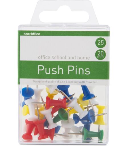 Push Pins i flotte farverMed Office Push Pins får du praktiske og farverige tegnestifter som nemt kan fastgøres til bløde underlag som f.eks. opslagstavler og korktavler. De små push pins er et must-have på ethvert kontor, da de giver god mulighed for en simpel organisering af f.eks. opslag, meddelelser, påmindelser, kvitteringer, bonner og bilag på opslagstavlen. De praktiske tegnestifter har en lille nål på 10 mm og et farverigt plastgreb med en bred top, som sikrer at tegnestifterne nemt kan trykkes ind i opslagstavlen, så du hurtigt og let kan holde styr på alle dine opslag, så vigtige papirer, noter og huskesedler ikke forsvinder i bunken på skrivebordet.De farverige push pins kan også med fordel bruges som markeringsnåle til fremhævninger på kort og dokumenter, så du nemt kan afmærke vigtige områder og byer på et landkort eller hurtigt kan markere vigtige afsnit og passager i et dokument.Antal: 25 stk.Farve: AssorteretLængde på nål: 10 mmLængde med greb: 20 mm ...