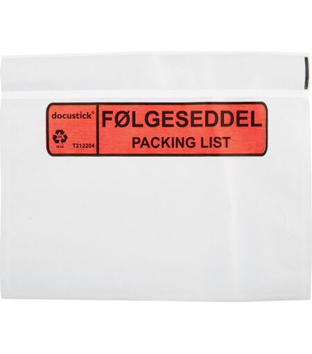 Forsendelseslommer, dokumentlommer eller følgeseddellommer - hvad end du kalder dem, så er de uundværlige, når din virksomhed skal sende pakker afsted. Selvklæbende dokumentlommer – synlig og sikker forsendelse Dokumentlommerne gør det nemt for dig at tilføje følgesedler, faktura, pakkelabel eller anden relevant information til din forsendelse. Forsendelseslommerne har selvklæbende bagside med stærk lim, som fæstner på stort set alle overflader, og dermed gør det nemt og hurtigt at sætte på din pakke - helt uden brug af tape. Med de transparente og selvklæbende dokumentlommer sikrer du, at dine dokumenter er beskyttet mod vind, vejr og slid, samtidig med at de er synlige for kontrol. Dokumenterne vil ikke være tilgængelige for uvedkommende, uden at lommen brydes. Sådan finder du den rette størrelse følgeseddellomme Følgeseddellommernes størrelse er angivet med en størrelsesbetegnelse på samme måde, som man kender det fra konvolutter og papir. En dokumentlomme i størrelsen C5 er altså lavet til et papir i størrelsen A5. Man kan også bruge et A4, der er foldet. Hvis du er i tvivl, om du har fundet den rette størrelse, kan du altid se længde og bredde angivet i millimeter under specifikationer på det enkelte produkt. Specifikationer: Betegnelse: C6 Mærke: Docustick Indvendige mål: 165 x 122 mm Tryk: "Følgeseddel/Packing List" Plastkvalitet: 40 my Bagark kvalitet: 46 g Limmængde: 20 g Æske a 1000 stk ...