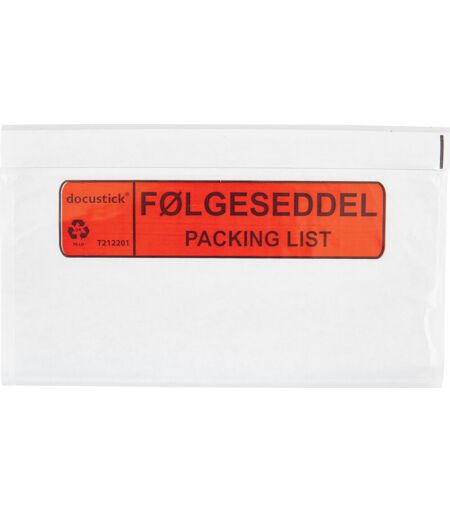 Forsendelseslommer, dokumentlommer eller følgeseddellommer - hvad end du kalder dem, så er de uundværlige, når din virksomhed skal sende pakker afsted. Selvklæbende dokumentlommer – synlig og sikker forsendelse Dokumentlommerne gør det nemt for dig at tilføje følgesedler, faktura, pakkelabel eller anden relevant information til din forsendelse. Forsendelseslommerne har selvklæbende bagside med stærk lim, som fæstner på stort set alle overflader, og dermed gør det nemt og hurtigt at sætte på din pakke - helt uden brug af tape. Med de transparente og selvklæbende dokumentlommer sikrer du, at dine dokumenter er beskyttet mod vind, vejr og slid, samtidig med at de er synlige for kontrol. Dokumenterne vil ikke være tilgængelige for uvedkommende, uden at lommen brydes. Sådan finder du den rette størrelse følgeseddellomme Følgeseddellommernes størrelse er angivet med en størrelsesbetegnelse på samme måde, som man kender det fra konvolutter og papir. En dokumentlomme i størrelsen C5 er altså lavet til et papir i størrelsen A5. Man kan også bruge et A4, der er foldet. Hvis du er i tvivl, om du har fundet den rette størrelse, kan du altid se længde og bredde angivet i millimeter under specifikationer på det enkelte produkt. Specifikationer: Betegnelse: C65 Mærke: Docustick Indvendige mål: 225 x 122 mm Tryk: "Følgeseddel/Packing List" Plastkvalitet: 40 my Bagark kvalitet: 46 g Limmængde: 20 g Æske a 1000 stk ...