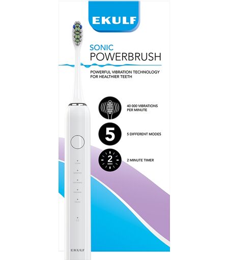 EKULF Sonic PowerBrush elektrisk tandbørste giver en effektiv rengøring og tandkødsmassage med kraftig sonisk teknologi. EKULF Sonic PowerBrush er vores kraftige elektriske tandbørste med 40.000 vibrationer per minut, designet til at give en effektiv rengøring af tænderne. Det lille ovale børstehoved når selv svært tilgængelige områder mellem tænderne og fjerner plak på en skånsom måde. De soniske vibrationer giver også en massage til tandkødet, hvilket øger blodcirkulationen og fremmer et sundere tandkød. Tandbørsten tilbyder flere børstetilstande for at dække dine individuelle behov - vælg mellem CLEAN, SENSITIVE, WHITENING, MASSAGE og POLISH for at skabe en personlig og skånsom rengøringsrutine. Takket være den smarte tryksensor, som lyser rødt, hvis du børster for hårdt, og en indbygget 2-minutters timer med 30 sekunders intervalpåmindelse, sikrer du optimal mundhygiejne hver gang du børster. Med et batteri, der holder op til 120 dage mellem opladninger, behøver du heller ikke bekymre dig om hyppig opladning. ...