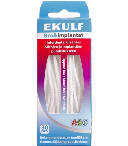 EKULF Bro&Implantat er en tandtråd med flosset børstedel på midten og afstivede ender. EKULF Bro&Implantat tandtråd er særligt formet til at rense under broer og implantater. ...