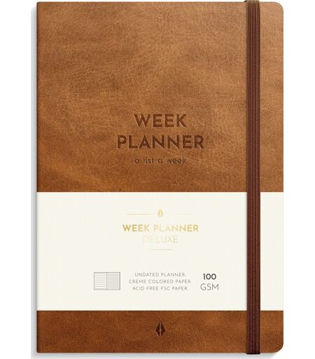 Burde Week Planner Deluxe Du får her en lækker ugeplanlægger, som er perfekt til at give dig det fulde overblik over dine opgaver, aftaler og mål for ugen. Med et overskueligt layout, hvor du selv udfylder dato og ugenummer, kan du nemt planlægge og prioritere dine daglige opgaver. Det gør også at du selv kan bestemme, hvornår dit år skal begynde. Planlæggeren er indbundet med et omslag i lækkert kunstlæder, som fint holdes lukket med elastik. I bogen finder du linjerede sider, et smart bogmærkebånd samt en praktisk lomme til løse papirer bagerst i planlæggeren. Indbundet notesbog med omslag i kunstlæder Med elastik, mærkebånd og lomme Engelsksproget indhold A5 format: 21 x 14,8 cm Linjeret 176 sider Papirkvalitet: 100 g FSC-certificeret papir Mayland Burde - kalendere og notesbøger siden 1900-tallet Mayland-Burde producerer hvert år millioner af kalendere og notesbøger til alle formål og har siden 1900-tallet leveret kalendere til danskerne. Sortimentet er baseret og sammensat på baggrund af et ønske om et bredt og tidssvarende udvalg af kalendere, notesbøger og tilbehør. Hos Mayland-Burde bestræber man sig nemlig på at imødekomme kundernes mange forskellige ønsker og behov og har en passion for at kunne levere produkter der skaber både glæde og overblik i hverdagen, på jobbet og på studiet. ...