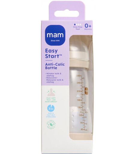 1 stk. a 260 ml Til 0+ måneder med flaskesut i str. 1 MAM Easy Start Anti-Colic Bottle er designet til at forebygge kolik og andre almindelige problemer som kan opstå ved madning. Det innovative antikoliksystem med en ventil i bunden forhindrer, at der dannes luftbobler i væsken, og hjælper dit barn med at drikke mere afslappet. Den unikke flade form på sutten efterligner moderens brystvorte under amning og giver barnet en velkendt fornemmelse. Det gør det lettere at skifte mellem amning og flaskemadning. Sutten passer til alle MAM-flasker og Trainer. Lækagesikkert låg, der også kan bruges som mål. Flasken kan nemt steriliseres i mikrobølgeovnen på 3 minutter - det sparer tid og op til 85 % energi og CO2*. ...