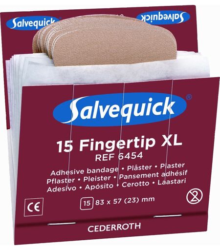 Kvalitetsplaster til fingrene Salvequick Plaster XL Fingerspids er ekstra store plastre særligt udviklet til sår på fingerspidserne. Dermed sidder fingerspidsplasteret bedre fast på fingeren end almindelige plastre, og det er smidigt og behageligt at have på. Plastrene er allergitestede og fremstillet af tekstilmateriale. Pakken indeholder 15 sterile plastre i formatet 87 x 58 (23) mm. Pakken passer som genopfyldning (REF6454) i Salvequick plasterautomater. ...