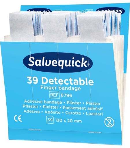 Kvalitetsplaster til brug i fødevareindustrienMed dette Salvequick Fingerplaser får du ekstra lange plastre, særligt udviklet til sår og mindre skader på fingerne og hænderne. De blå plastre er specielt fremstillet til brug indenfor fødevareindustrien, da den blå farve gør dem meget lette at se visuelt. Samtidig er plastrene sporbare og kan nemt registreres af de fleste metaldetektorer - hvilket er en ekstra sikkerhed når der arbejdes med fødevarer. Plastrene er fleksible og smidige, så de er lette at vinde rundt om en finger. Fleksibiliteten og smidigheden i plasteret gør at det er behageligt at have på og gør samtidig at du også med fordel kan bruge plasteret på mere vanskelige og utilgængelige steder på hænderne. Dertil er plastrene allergitestede og fremstillet i blødt tekstilmateriale.Pakken indeholder 39 sterile plastre i formatet 120 x 20 mm og pakken passer som genopfyldning i salvequick plasterautomater i diverse førstehjælpsstationer og førstehjælpskasser.Referencenummer: REF 6796 ...