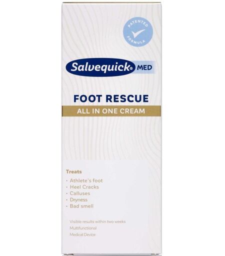 Salvequick Foot Rescue er en multifunktionel fodcreme, som behandler forskellige fodrelaterede lidelser, fodsvamp, hælrevner, hård hud, tørre fødder og dårlig lugt. Bemærkning Opbevares utilgængeligt for børn og ved stuetemperatur.Må ikke anvendes, hvis du er gravid eller ammer. Dosis og anvendelse Salvequick Foot Rescue kan anvendes til at behandle og forebygge spredning og/eller forværring af fodsvamp, hælrevner, hård hud og tørre fødder.Skal anvendes af voksne.Smør et pumpetryk på hver fod, så hele det område, der skal behandles, er dækket.Behandl begge fødder, så spredning forhindres.Påsmøres to gange dagligt, til alle symptomerne er helt væk. ...