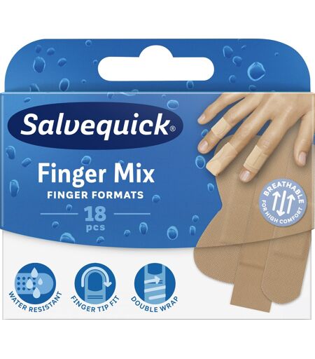 Salvequick Finger Mix, pakke med 18 forskellige plastrePlastre til hænder og fingreSår på fingrene opstår alt for ofte, f.eks. hvis hvis du har skåret dig. Det kan være svært at finde et plaster, der passer perfekt til fingrene. Finger Mix fra Salvequick indeholder plastre i forskellige former, som lavet til bedre at kunne passe til hænder og fingre.Plastrene er allergitestede, vand- og smudsafvisende. Fingreplastrene er længere end normale plastre, så de kan nå flere gange rundt om fingeren. Lader huden ånde.18 plastre i forskellige formerAllergitestedeVand- og smudsafvisendeRengør såret, så det ikke er inficeret og skift plaster hver dag. ...