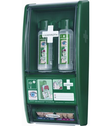 Effektiv og hurtig førstehjælp Cederroth Øjenskyllestation er et praktisk skab med plads til to flasker med øjenskyllevæske, som automatisk åbnes når de vrides ud af deres holdere. Dermed er øjenskyllestationen designet til at kunne yde hurtig hjælp, når der er brug for den. Flaskerne med øjenskyllevæske giver en rigelig væskestrøm til øjet, og de har en ekstremt lang holdbarhed på 4,5 år. Øjenskyllevæsken har en neutraliserende effekt på basiske væsker og syrer i øjet, så den giver et hurtigere resultat end normale saltvandsopløsninger. Øjenskyllestationen indeholder også en Salvequick plasterautomat, så virksomheden kan have førstehjælpsudstyret i det samme smarte skab.Mål (BxHxD): 29x56x12 cmReferencenummer: REF 721500 Øjenskyllestationen inderholder: 2 stk. Cederroth Øjenskyl 2 x 500 ml (REF 725200)1 stk. Salvequick Plasterdispenser inkl.45 Salvequick Plastplaster (REF 6036)40 Salvequick Tekstilplaster (REF 6444)1 stk. Øjenskylinstruktion1 stk. Refillnøgle ...