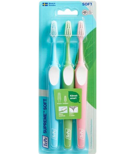 TePe Supreme Soft Tandbørste kommer i assorterede farver. TePe Supreme Soft Tandbørste er med en unik uformning af hår i 2 niveauer for bedre tilgængelighed. Derudover har tandbørsterne et smalt børstehoved for optimal adgang samt et bøjeligt tandbørsteskaft med tommelgreb for ekstra komfort. Rengør effektivt med en blødere fornemmelse. De lange hår når længere ind mellem tænderne og langs tandkødsranden, mens de rengør resten af tanden. Skaft produceret af plantebaseret materiale samt det meste af blisteremballagen består af genbrugsmateriale. Dosis og Anvendelse Anvendes morgen og aften. ...