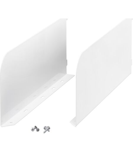 2 stk. hyldegavle i hvid til Elfa hylder Hvis du har behov for en afslutning på din hylde, så dine ting bliver indenfor hyldens kanter, kan du med fordel benytte dig af hyldegavlene. Hyldegavlene kan også bruges som bogstøtter. Der medfølger 2 hyldegavle i pakken, én til venstre side af hylden og en til højre side af hylden. Hyldegavlene kan bruges sammen med melaminhylder fra Elfa med en dybde på 30 cm. Montér let hyldegavlene på siderne af hylderne. Brug de medfølgende skruer til at skrue hyldegavlene fast på undersiden af melaminhylden. Hyldegavlene erstatter konsollerne, så det er hyldegavlene som holder hylderne oppe. Specifikationer: Mål (L x D x H): 25 x 300 x 164 mm 2 stk. hyldegavle i hvid 30 cm. (én til venstre side og én til højre side) Inkl. 4 skruer der passer til melaminhylderne på 19 mm. fra Elfa Vi kan skaffe mange flere dele i opbevaringssystemet, kontakt os for flere muligheder. 10 års garanti Elfa tilbyder 10 års garanti på deres produkter, gælder ved normal brug og anvendelse. Garantien gælder fra datoen af købet. Skulle du være uheldig at en del er gået i stykker, så kontakt da vores kundeservice som sidder klar til at hjælpe dig. Sørg for at tage billeder af produktet som er gået i stykker, gerne fra ca. 1 meters afstand og et billede helt tæt på skaden, gerne med en mindre genkendelig genstand ved siden af, så måleforholdet kan tydes (f.eks. en kuglepen). Hav også gerne dit ordrenummer/faktura fra købet klar. ...
