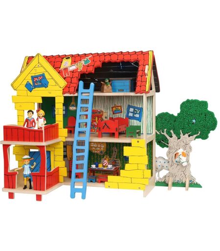 Välkommen till Villa Villekulla, där det alltid händer spännande och roliga saker! Här möts Pippi Långstrump och hennes vänner för födelsedagskalas, spunkjakt, sakletaräventyr och mycket annat. Ibland kommer även Kling och Klang på besök! Villa Villekulla är ett inspirerande dockhus som bjuder in till lek i Pippis värld. Dockhuset är öppet från tre håll så att flera barn kan upptäcka och leka i dockhuset tillsammans. Setet innehåller: 1 dörr balkong veranda 2 våningar vind stege 1 sockerdricksträd som figurerna kan krypa igenom Figurer och möbler köps separat. Pippi - Lek med världens starkaste flicka! Det är inte konstigt att Pippi är många barns favorit. Astrid Lindgrens berättelser om Pippi Långstrump fortsätter att underhålla barn och Ingrid Vang Nymans klassiska illustrationer ger leksakerna lekfullt liv. Varning! Inte lämplig för barn under 36 månader. Små delar. Kvävningsrisk. ...