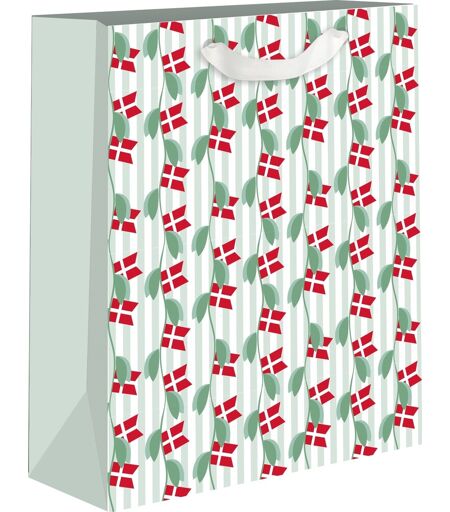 Gavepose med Dannebrog og blade, str. M, 1 stk. Gør din gave ekstra festlig med denne smukt designede gavepose med Dannebrog og dekorative blade. Den mellemstore størrelse er perfekt til at pakke mindre gaver ind såsom bøger, accessories eller delikatesser. Posen er fremstillet af kraftigt papir og har solide hanker, så den er nem at bære. En ideel løsning til fødselsdage, jubilæer og andre festlige lejligheder, hvor en elegant præsentation gør en forskel. Specifikationer: Motiv: Dannebrog med blade Materiale: Kraftigt papir Højde: 27,5 cm Bredde: 21,5 cm Dybde: 8 cm Antal: 1 stk. ...