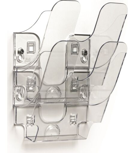 Durable Flexiplus 2 A5 Brochurestativ – fleksibel opbevaring og præsentationFlexiplus A5 fra Durable er fleksible og rummelige brochureholdere i flot design til diverse materialer i A5 størrelse.Med Durable Flexiplus 2 A5 høj får du et smart og praktisk brochurestativ med 2 separate fag, for en pæn opbevaring og fremvisning af brochurer, magasiner, blanketter, tidsskrifter og lign i A5 højformat. Den er derfor velegnet at have hængene i receptioner og venteværelser, samt på kontoret, hvor du har behov for at skabe et sted til organisering og præsentation eller til en hurtig arkivering.Brochureholderen monteres på væggen med de medfølgende skruer, så du hurtigt og nemt kan skabe orden og et godt overblik. Hvert fag kan indeholde bundter på op til 23 mm i tykkelsen og fagene i Flexiplus giver desuden mulighed for en god fleksibilitet, da hvert fag både kan sættes op enkeltvis eller kan sammensættes ved at anvende den smarte snap lås – du bestemmer derfor selv hvordan du ønsker at udnytte holderens kapacitet og muligheder. Farve: TransparentFormat: A5 højformatAntal fag: 2Mål 1 fag (BxHxD): 180 x 195 x 100 mm Mål samlet 2 fag (BxHxD): 180 x 250 x 100 mmMaks kapacitet pr. fag: 23 mm tykke bundter ...