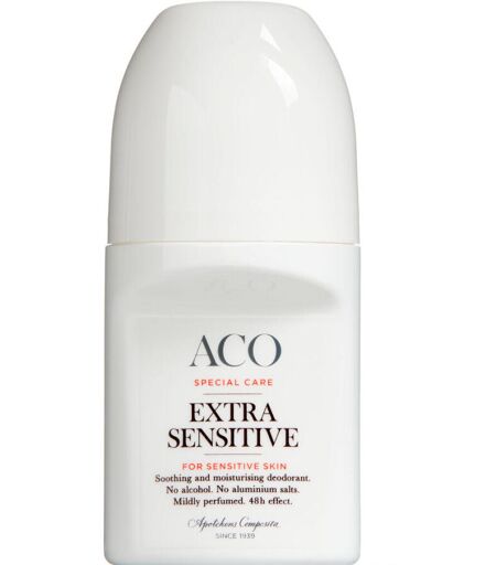 ACO Special Care Deo Extra Sensitive roll-on er en ekstra mild og blødgørende creme-deodorant med 48 timers effekt, så du føler dig ren, frisk og selvsikker hele dagen. Deodoranten er alkoholfri og uden aluminiumssalte. Dosis og Anvendelse Smøres under armen. ...