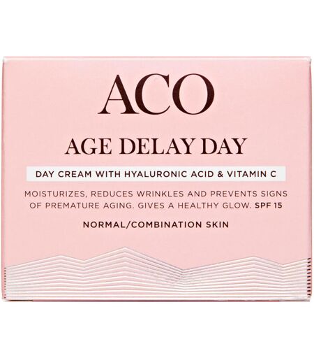 ACO Age Delay Day Cream Normal hud med parfume er en let og effektiv anti-age dagcreme til normal/kombineret hud. Modvirker for tidlig aldring af huden og reducerer rynker. Huden beskyttes mod UV-lys og frie radikaler. For en glat hud med naturlig glans. Dosis og Anvendelse Anvendes morgen efter rensning af ansigt. ...