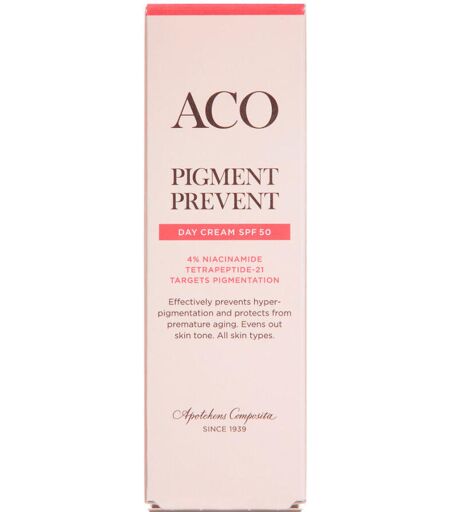 ACO Anti-pigment Reduce Dag Creme SPF50 Hjælper med at beskytte mod solskader og for tidlig aldring/fotoældning Forebygger/beskytter effektivt mod og reducerer hyperpigmentering, såsom mørke pletter. Udjævner hudtonen og hjælper med at genoprette en jævn hudtone. Forsinker tegn på aldring. Fugter og strammer huden op og sikrer ensartet hud. ...