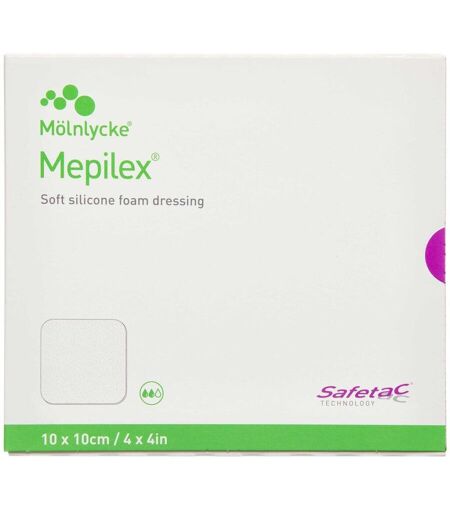 Tynd selvklæbende absorberende skumpude, som huden kan ånde igennem. Til let- og ikke væskende sår. Kan klippes til efter behov. Kræver fiksering (Tubifast, Mefix eller Mepitac). Produktet hæfter med det unikke og bløde silikoneklæb Safetac. Du vil derfor kunne genklæbe produktet, hvis du har løftet det fra huden for at tilse såret. Giver en hurtigere opheling af såret og en pænere ardannelse. Til skrøbelig hud (eksempelvis pga prednisolonbehandling) samt ved hudreaktioner efter strålebehandling. Produktet efterlader ingen klæberester på huden og det gør ikke ondt at tage det af. Bemærkning Kan også anvendes til hudafskrabninger, diabetiske fodsår og brandsår. Kan anvendes, hvis du er allergisk overfor almindeligt limklæbestof.Anvendes ikke, hvis pakningen er brudt eller beskadiget.Produktet bør anvendes under opsyn af sunhedsfagligt personale.Må ikke anvendes i tilfælde af overfølsomhed eller allergi over for et eller flere af indholdsstofferne.Kombinér ikke med andre oxiderende midler.Kontakt sundhedsfagligt personale ved tegn på infektion.Må ikke genanvendes.Sterilt. Må ikke resteriliseres. Dosis og Anvendelse Rens såret og tør huden.Vælg en passende størrelse. Mepilex skal overlappe den omkringliggende hud. Klip evt. Mepilex til.Fjern den første beskyttelsesfilm.Fiksér, hvis nødvendigt.Intervallet for bandageskift kan vare flere dage. Skift bandagen, inden den er helt mættet, ved tegn på lækage eller i henhold til klinisk praksis. ...