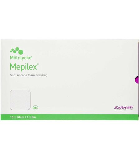 Mepilex er en meget formbar bandage, der absorberer væske, opretholder et fugtigt sårhelingsmiljø og minimerer risikoen for maceration. Bandagen har et safetac sårkontaktlag, som er en unik klæbeteknologi. Det minimerer smerte hos patienter og traume på såret og den omkringliggende hud ved bandageskift. Bemærkning Må ikke anvendes på patienter med kendt overfølsomhed over for bandagen eller dens materialer.Må ikke bruges sammen med oxiderende midler som f.eks. hypochloritopløsninger eller hydrogenperoxid.Hvis der iagttages tegn på klinisk infektion, f.eks. feber eller hvis såret eller det omkringliggende hudområde bliver rødt, varmt eller hævet, skal du kontakte sundhedsfagligt personale vedrørende passende behandling.Produktet må ikke genanvendes. Hvis det genanvendes, kan det komme til at fungere dårligere, og der kan forekomme krydskontaminering.Steril. Må ikke anvendes, hvis den sterile barriere er beskadiget eller har været åbnet før anvendelse. Må ikke steriliseres igen. Dosis og Anvendelse Rens såret i henhold til de kliniske retningslinjer.Tør den omkringliggende hud grundigt.Vælg en passende bandagestørrelse. Mepilex skal overlappe den tørre, omkringliggende hud med mindst 1-2 cm, når der benyttes mindre størrelser og 3-5 cm, når der benyttes større størrelser. Dette for at beskytte den omkringliggende hud mod maceration og for at fiksere bandagen på sikker vis. Mepilex kan klippes til efter behov, så den passer til forskellige sårformer, sårstørrelser og sårplaceringer.Fjern den første beskyttelsesfilm, og applicer bandagen med den klæbende side mod såret.Fjern den resterende beskyttelsesfilm, og udglat bandagen mod huden. Stræk ikke bandagen.Hvor det er nødvendigt, kan Mepilex fikseres med en bandage eller anden fiksering.Intervallet for bandageskift kan vare flere dage. Skift bandagen, inden den er helt mættet, ved tegn på lækage eller i henhold til klinisk praksis. ...