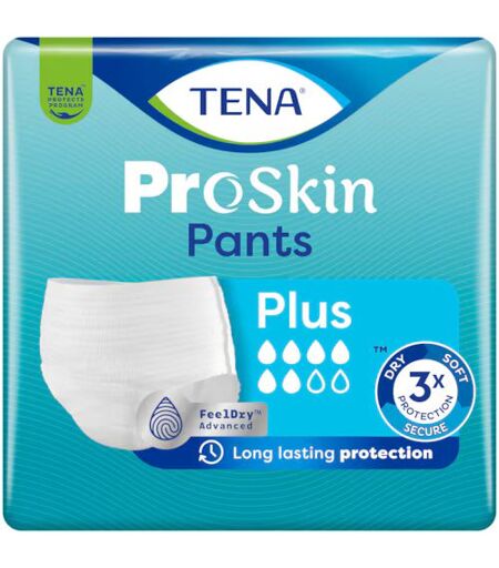 TENA ProSkin Pants Plus er buksebleer, der yder 100% beskyttelse ved moderat til svær inkontinens, med hurtig absorbering og længerevarende tørhed om dagen eller natten. De er pålidelige engangsunderbukser til en aktiv livsstil, fremstillet til daglig brug af kvinder og mænd. Vores kerne med FeelDry Advanced teknologi absorberer straks væske, indkapsler den og leder hurtigt væske væk fra overfladen for at holde huden tør og bedre beskyttet. Den absorberende kerne neutraliserer straks lugt for maksimal tryghed og diskretion. TENA ProSkin Pants har en kropsnær pasform og er designet med henblik på komfort. Det tekstillignende, åndbare og elastiskemateriale giver en følelse af sikkerhed kombineret med stor bevægelsesfrihed. Disse buksebleer sikrer maksimal tryghed med TENAs pålidelige Triple Protection mod tørhed, blødhed og lækagesikkerhed. TENA ProSkin Pants er dermatologisk testede og anbefalede af Skin Health Alliance. De er skånsomme mod huden og designet til at reducere risikoen for irritation for at bevare en sund hud. TENA ProSkin Pants er bløde, tørre og sikre og tilbyder den nødvendige komfort, beskyttelse og tryghed til et aktivt liv. Omkreds 65-85 cm. ...