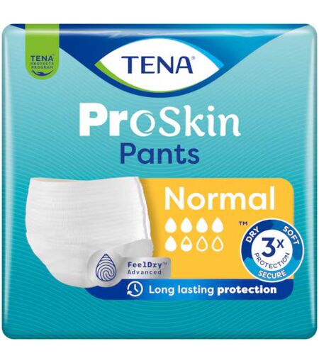 TENA ProSkin Pants Normal er buksebleer, der yder 100% beskyttelse ved moderat til svær inkontinens, absorberer to gange hurtigere* og tilbyder længerevarende tørhed om dagen eller natten. De er pålidelige engangsunderbukser til en aktiv livsstil, fremstillet til daglig brug af kvinder og mænd. Kernen med FeelDry Advanced teknologi absorberer straks væske, indkapsler den og leder hurtigt væske væk fra overfladen for at beskytte huden bedre og holde den 30% mere tør. Den absorberende kerne neutraliserer straks lugt for maksimal tryghed og diskretion. TENA ProSkin Pants har en kropsnær pasform og er designet med henblik på komfort. Det tekstillignende, åndbare og elastiske materiale giver en følelse af sikkerhed kombineret med stor bevægelsesfrihed. Disse buksebleer sikrer maksimal tryghed med TENAs pålidelige Triple Protection mod tørhed, blødhed og lækagesikkerhed. TENA ProSkin Pants er dermatologisk testede og godkendte af Skin Health Alliance. De er skånsomme mod huden og designet til at hjælpe med at reducere risikoen for irritation for at bevare en sund hud. TENA ProSkin Pants er bløde, tørre og sikre og tilbyder den nødvendige komfort, beskyttelse og tryghed til et aktivt liv. Omkreds: 100-135 cm ...