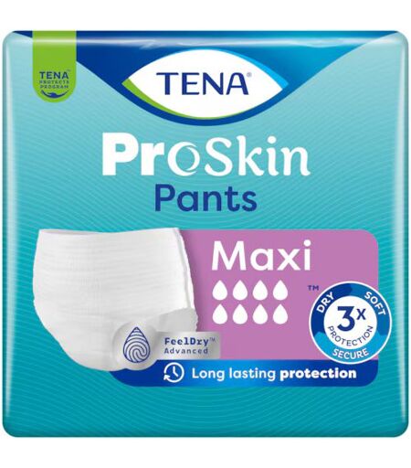 TENA ProSkin Pants Maxi er buksebleer, der yder 100% beskyttelse ved moderat til svær inkontinens, med hurtig absorbering og længerevarende tørhed om dagen eller natten. De er pålidelige engangsunderbukser til en aktiv livsstil, fremstillet til daglig brug af kvinder og mænd. Vores kerne med FeelDry Advanced teknologi absorberer straks væske, indkapsler den og leder hurtigt væske væk fra overfladen for at holde huden tør og bedre beskyttet. Den absorberende kerne neutraliserer straks lugt for maksimal tryghed og diskretion. TENA ProSkin Pants har en kropsnær pasform og er designet med henblik på komfort. Det tekstillignende, åndbare og elastiske materiale giver en følelse af sikkerhed kombineret med stor bevægelsesfrihed. Disse buksebleer sikrer maksimal tryghed med TENAs pålidelige Triple Protection mod tørhed, blødhed og lækagesikkerhed. TENA ProSkin Pants er dermatologisk testede og anbefalede af Skin Health Alliance. De er skånsomme mod huden og designet til at reducere risikoen for irritation for at bevare en sund hud. TENA ProSkin Pants er bløde, tørre og sikre og tilbyder den nødvendige komfort, beskyttelse og tryghed til et aktivt liv Omkreds 120 - 160 cm. ...