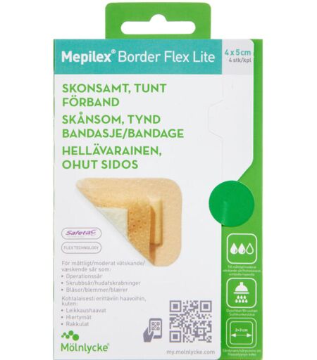 Mepilex Border Flex Lite er en tynd, yderst formbar, selvklæbende og absorberende bandage, der opretholder et fugtigt sårhelingsmiljø. Det vandtætte yderlag beskytter såret mod snavs og bakterier. Bandagen har et Safetac-sårkontaktlag, som er en unik klæbeteknologi. Det minimerer smerte hos patienterne og traume på såret og den omkringliggende hud ved bandageskift. Mepilex Border Flex Lite er udviklet til behandling af et bredt udvalg af ikkevæskende til moderat væskende sår, såsom ben- og fodsår, tryksår, operationssår og traumatiske sår, f.eks. hudafskrabninger, blister og rifter. Mepilex Border Flex Lite kan også benyttes som beskyttelse af ødelagt og/eller skrøbelig hud. Mepilex Border Flex Lite består af: Et sårkontaktlag bestående af blød, selvklæbende silikone (Safetac) og et bærende lag af film. En fleksibel absorberende pude med to lag: Et lag af skum samt et non-woven spredningslag, som er perforeret med Flex-teknologi. En filmbagside, der er åndbar, men vandtæt, som yder en barriere mod udefra kommende urenheder. Bemærkning Mepilex Border Flex Lite må ikke anvendes på patienter og/eller brugere med kendt overfølsomhed over for de materialer/komponenter, der indgår i produktet.Må ikke bruges sammen med oxiderende midler som f.eks. hypochloritopløsninger eller hydrogenperoxid.Hvis der iagttages tegn på klinisk infektion, f.eks. feber, eller hvis såret bliver rødt, varmt eller hævet, skal du kontakte sundhedsfagligt personale vedrørende passende behandling.Må ikke genanvendes. Hvis produktet genanvendes, kan det komme til at fungere dårligere, og der kan forekomme krydskontaminering.Steril. Må ikke anvendes, hvis den sterile barriere er beskadiget eller har været åbnet før anvendelse. Må ikke resteriliseres. Dosis og Anvendelse Mepilex Border Flex Lite kan bruges af ikke-fagpersoner under tilsyn af sundhedspersonale. Rens såret i henhold til de kliniske retningslinjer.Tør den omkringliggende hud grundigt.Vælg en passende bandagestørrelse. Sårpuden skal dække den tørre omkringliggende hud med mindst 1-2 cm , således at den omkringliggende hud beskyttes mod maceration, og bandagen sidder godt fast.Fjern den første beskyttelsesfilm, og applicer bandagen med den klæbende side mod såret.Fjern den/de resterende beskyttelsesfilm, og udglat bandagen mod huden. Stræk ikke bandagen. Der kan gå flere dage mellem skift af bandagen. Skift bandagen, før den er helt mættet, ved tegn på lækage eller i henhold til klinisk praksis. ...