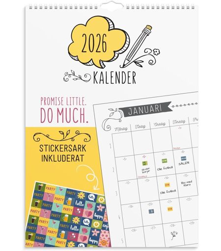 Väggkalender 2026 från Burde. Doodle vägg är en kalender i A3-format som hjälper dig att styra upp din månad på ett effektivt och kreativt sätt. Väggkalendern ger dig utrymme att anteckna, skapa listor, färglägga och dekorera med medföljande stickers. Skapa en personlig kalender där det är kul att planera! Format: A3. Layout: Månad/blad. Kalendarium: 2026-01-01 - 2026-12-31. Spiralbunden. Innehåll: Helgdagar, stickersark. Antal sidor: 12. Miljöinformation: FSC®. Legal manufacturer Name: Burde Publishing AB Legal manufacturer Adress: Box 3101, SE-350 43 VÄXJÖ Legal manufacturer website: www.burde.com Legal manufacturer e-mail: info@burde.com ...