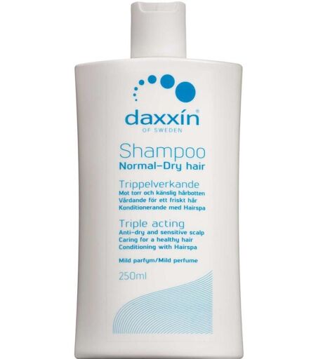 Daxxín Normal-Dry Shampoo er en mild og effektiv triple-virkende shampoo: Beroliger tør og følsom hovedbund. Fugtgivende med Hairspa. Giver et frisk hår med glans. Anvendelse: Ryst flasken før brug. Skyl håret og vask derefter håret skånsomt indtil der er rigeligt skum. Lad shampooen sidde i ca. 2 min. og skyl derefter shampooen grundigt ud. Gentag proceduren minimum 1 til 2 gange om ugen. Resultat: Beroliger tør og følsom hovedbund. Fugtgivende med Hairspa. Giver et frisk hår med glans. Dosis: Nok til at håret og hele hovedbunden er skummet til. ...