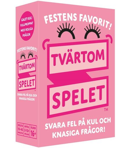 TVÄRTOMSPELET - Festens favorit! Säger man prosit når någon fiser? Är elvisp ett vanligt förnamn? Tvärtomspelet - Festens favorit är ett helknasigt och roligt spel - en verkligt kul partyhöjare som garanterat kommer lyfta stämningen på festen! Här gäller det att snabbt försöka svara fel, alltså tvärtom, på knasiga och kul frågor. Svara Ja istället för Nej och Nej istället för Ja. Var beredd på roliga felsägningar och massvis av skratt! Spelet är fullproppat med över 500 roliga frågor. Utmana din familj och se vem som klarar flest i rad! Rekommenderad ålder: Ferån 16 år Antal spelare: 2+ Speltid: 15-45 minuter Språk: Svenska ...