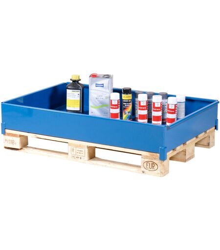 Pallebassin lav 150 l, HxBxD 20,5x81x125, Blå Smart kar til sikker opbevaring af kemikalier. Kan placeres oven på en EUR-palle. Specifikationer: Kapacitet: 1500 kg. Volumen: 150 liter Mål (HxBxD): 205x810x1250 mm Farve: Blå RAL 5019 Pulverlakeret overflade Vægt: 24 kg ...