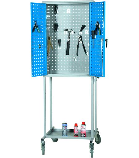 Stabil og stærk værktøjsvogn med perforering i alle vægge og låger. Leveres inkl. 20 blandede kroge Underskab kan tilkøbes Mål (HxBxD): 800x600x400 mm 4 drejelige hjul heraf 2 med bremse Vægt: 32 kg Let samling påkrævet ...