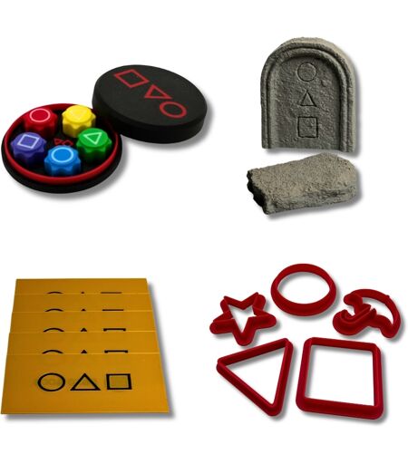 Dette er en pakke, der består af flere Squid Game spil. God fornøjelse med at spille. Held og lykke. Specifikationer: Materiale: PLA plastik Fremstillet med 3D teknologi. Bemærk: Dette produkt består af små dele, som kan udgøre en kvælningsfare. Holdes væk fra børn under 3 år. Pakken indeholder: 1 x Gonggi & Rundt Etui 1 x Biseokchigi Flying Stone 5 x Invitationskort 5 x Sugar Honeycombs Cookie Cutters ...