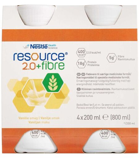 Resource 2.0+ fibre er enæringsmæssigt fuldgyldig ernæringsdrik med højt energiindhold. Resource 2.0+ fibre er egnet til ernæringsmæssig behandling af patienter med sygdomsrelateret underernæring eller i ernæringsmæssig risiko. Et godt valg for underernærede patienter, som har svært ved at spise og drikke store mængder. Velegnet som mellemmåltid og gerne fordelt på små portioner i løbet af dagen. Drikken kan også anvendes i forbindelse med væskerestriktion. Dispenseringsform Ernæringsdrik. Dosis og anvendelse Drikken er velegnet til voksne og børn over 3 år. Omrystes før brug. Til oralt brug eller sondeernæring. Tilsæt ikke andet mad eller medicin, hvis produktet anvendes som sondeernæring. Ifølge ordinationen eller 1-3 flasker pr. dag som supplement. Som eneste kilde til ernæring ifølge lægens eller diætistens anbefaling. ...