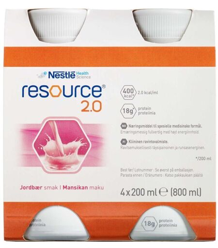 Resource 2.0 er egnet til ernæringsmæssig behandling af sygdomsrelateret underernæring. Resource 2.0 er velegnet som mellemmåltid og gerne fordelt på små portioner i løbet af dagen. Anvendes efter anbefaling fra læge eller diætist. Drikken er velegnet til voksne og børn over 3 år, men skal bruges med forsigtighed til børn mellem 3-6 år. Andre pakningsstørrelser Resource 2.0 findes i 5 forskellige smagsvarianter: abrikos, jorbær, vanille, ananas-mango, mintchokolade og en mix pakke. Dispenseringsform Ernæringsdrik Dosis og anvendelse Ifølge ordination fra lægen eller 1-3 flasker dagligt som mellemmåltid. Kan anvendes som eneste kilde til ernæring. Omrystes før brug og serveres kold. Kan fryses til is. ...