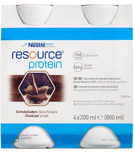 Resource Protein er en ernæringsdrik med ekstra energi og protein. Drikken fungerer godt som mellemmåltid for dem, som har et forhøjet energi- og proteinbehov som fx. ved sårheling, muskelopbygning eller som et tilskud til den øvrige kost. Desuden anbefales Resource Protein Ernæringsdrik til patienter uden appetit eller ved utilstrækkelig næringsindtag. Andre pakningsstørrelser Resource Protein findes i 6 forskellige smagsvarianter: abrikos, chokolade, jordbær, kaffe, skovbær og vanille samt en mix pakke. Dispenseringsform Ernæringsdrik Dosis og anvendelse Ifølge ordination eller 1-3 flasker pr. dag som supplement. Ikke egnet som eneste kilde til ernæring. Omrystes før brug, serveres kold. Smagsvarianter med chokolade og kaffe kan serveres let opvarmet. Ved opvarmning i mikrobølgeovn skal Resource Protein hældes over i en anden beholder. Drikken er velegnet til voksne og børn over 3 år og kan med forsigtighed anvendes til børn mellem 3-5 år. ...