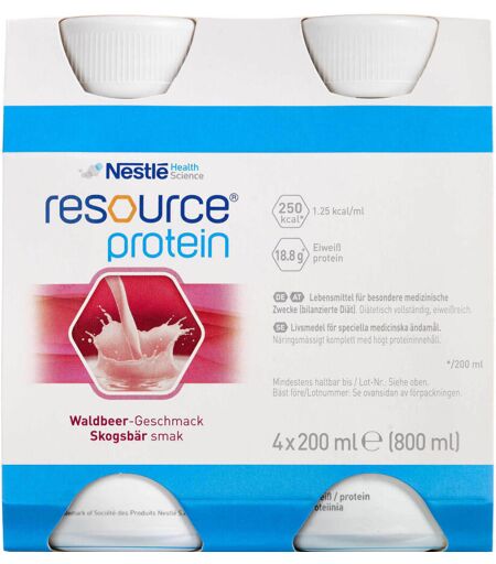 Resource Protein er en ernæringsdrik med ekstra protein. Produktegenskaber Fuldgyldig proteinrig ernæringsdrik med en tynd konsistens og et relativt lavt fedtindhold.Resource Protein er beregnet til kostbehandling af sygdomsrelateret underernæring.Med skovbærsmag. Velegnet til Velegnet ved genopbygning eller bevarelse af muskulatur og immunforsvar samt ved sårheling, hvor protein er en vigtig del af ernæringsbehandlingen, eller som et tilskud til den øvrige kost. Desuden anbefales Resource Protein Ernæringsdrik til patienter uden appetit eller ved utilstrækkelig næringsindtag. Anvendelse ...