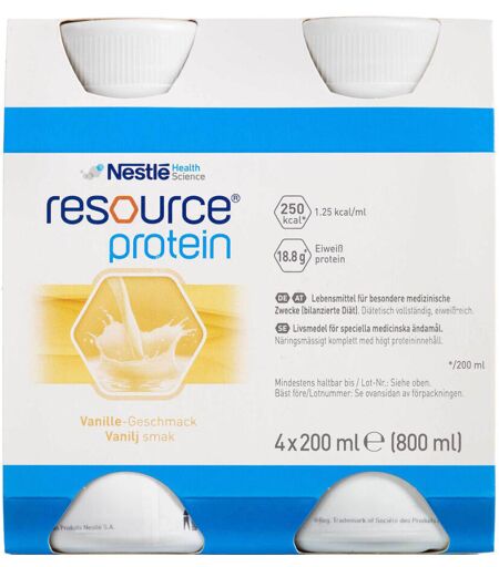 Resource Protein er en ernæringsdrik med ekstra energi og protein. Drikken fungerer godt som mellemmåltid for dem, som har et forhøjet energi- og proteinbehov som fx. ved sårheling, muskelopbygning eller som et tilskud til den øvrige kost. Desuden anbefales Resource Protein Ernæringsdrik til patienter uden appetit eller ved utilstrækkelig næringsindtag. Andre pakningsstørrelser Resource Protein findes i 6 forskellige smagsvarianter: abrikos, chokolade, jordbær, kaffe, skovbær og vanille samt en mix pakke. Dispenseringsform Ernæringsdrik Dosis og anvendelse Ifølge ordination eller 1-3 flasker pr. dag som supplement. Ikke egnet som eneste kilde til ernæring. Omrystes før brug, serveres kold. Smagsvarianter med chokolade og kaffe kan serveres let opvarmet. Ved opvarmning i mikrobølgeovn skal Resource Protein hældes over i en anden beholder. Drikken er velegnet til voksne og børn over 3 år og kan med forsigtighed anvendes til børn mellem 3-5 år. ...
