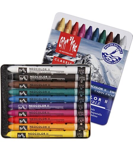 Akvarelkridt i flotte, rene og lysægte farverMed Neocolor II akvarelkridt fra Caran d’Ache får du vandopløselige akvarel vokspasteller i god og anerkendt kvalitet. Farverne er højpigmenteret, hvilket betyder at farvekridtende er meget flotte, stærke og rene i farverne. Dertil er farverne meget lysægte og har imponerende farve- og blandingsegenskaber og kan udmales med vand – så du nemt kan skabe de flotteste og mest farverige akvareltegninger og farvelægninger.Farve: AssorteretTykkelse: 8 mmLængde: 10 cmLysægte og stærke farver ...