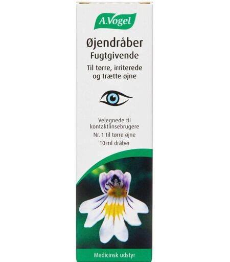 A. Vogel Øjendråber til tørre, irriterede og trætte øjne. Fugter og opfrisker øjeblikkeligt. Er også veleget til brugere af kontaktlinser. Produktet er velegnet til veganere. Bemærkning Dråberne må ikke bruges mere end 30 dage i træk.For at undgå infektioner bør produktet kun anvendes af én person.Efter første åbning har produktet en holdbarhed på 6 måneder.Hvis dine symptomer vedvarer i mere end 3 på hinanden følgende dage uden forbedring, bliver værre eller øjnene bliver betændt, skal du kontakte din optiker eller læge.Læs indlægssedlen før brug. Dosis og Anvendelse Voksne: 1 dråbe i hvert øje, 4-5 gange dagligt.Børn fra 12 år: 1 dråbe i hvert øje, 1-2 gange dagligt. ...