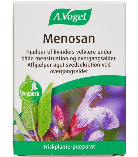 A. Vogel Menosan tabletter 90 stk. A. Vogel Menosan tabletter afhjælper øget svedsekretion ved overgangsalder. Dispenseringsform Tabletter Dosis og anvendelse 1 tablet dagligt. ...